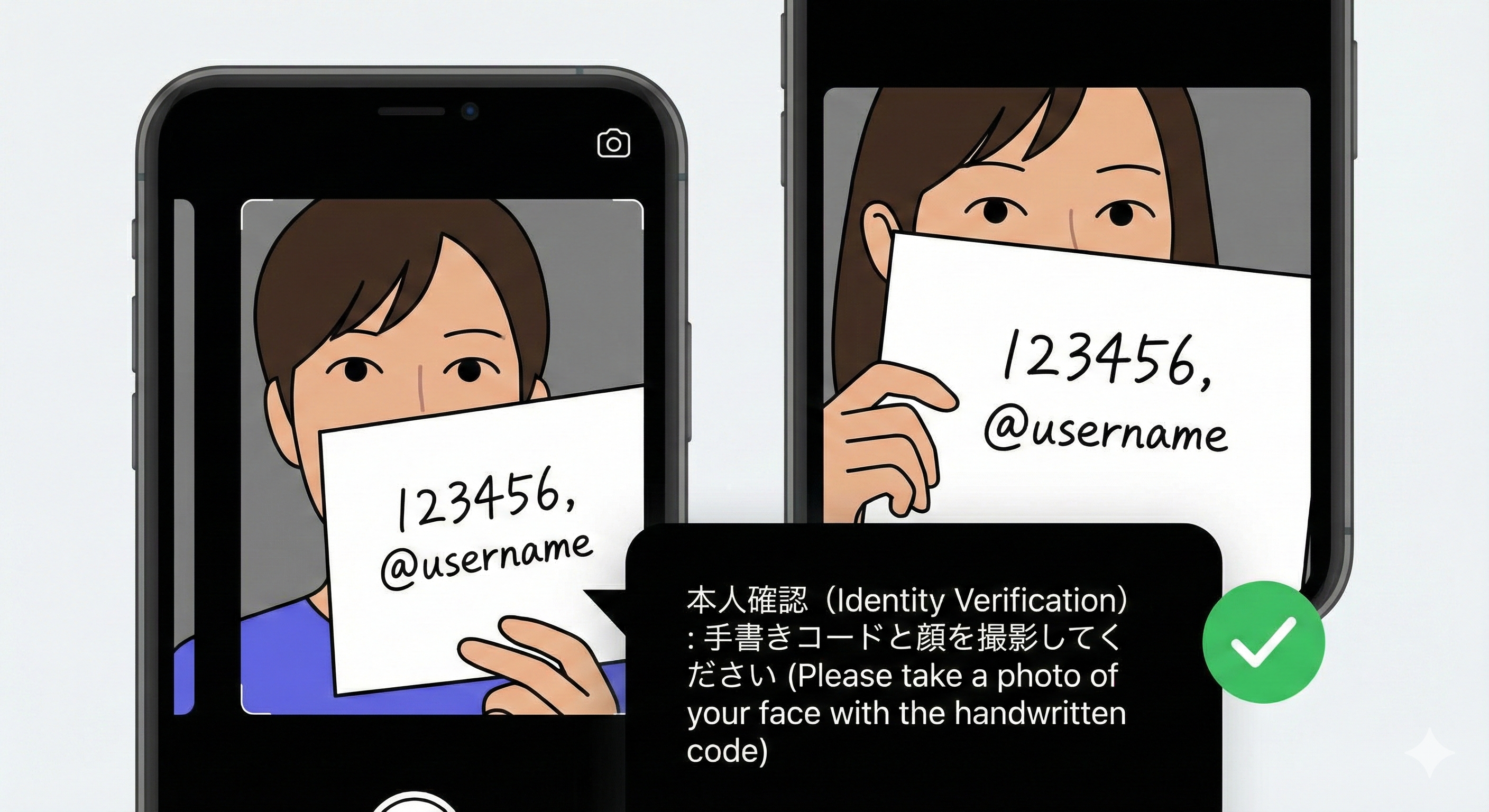 - 手書きコード認証: 画面に表示された数字と名前、ユーザーネームを手書きした紙を持ち、自分の顔と一緒に撮影してアップロードする。